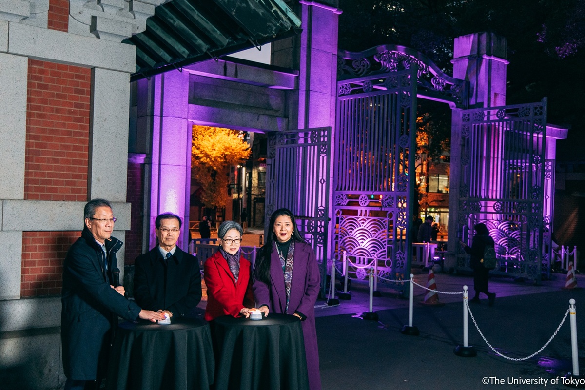 I attended a ceremony to illuminate UTokyo’s Hongo Main Gate to start the “Safer Campus at UTokyo” project.The Cabinet Office is promoting “Purple Light-up” campaign nationwide, in which broadcast towers and landmarks across the country are illuminated in purple. The color comes from the purple ribbon, which symbolizes the eradication of violence against women. Agreeing with the purpose, UTokyo lit up the Main Gate on the Hongo Campus from December 17-23, 2025.