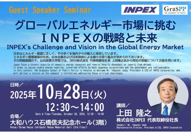 Japan faces a chronic scarcity of domestic energy resources and remains heavily dependent on imports from abroad. In order to secure stable energy supplies, concerted efforts by both Japanese corporations and the government are indispensable. In this context, the Graduate School of Public Policy is honored to welcome Mr. Takayuki Ueda, President & CEO of INPEX Corporation, who will deliver a lecture on the company’s initiatives addressing these critical challenges.
