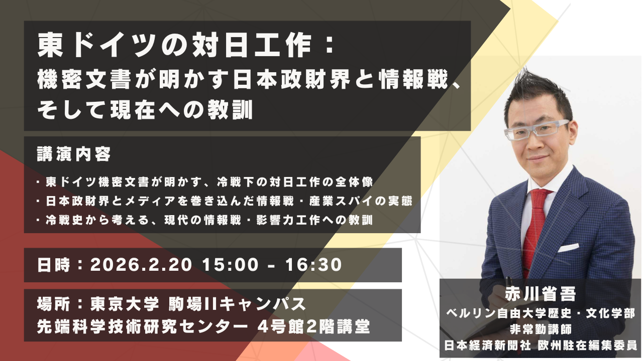 The lecture will examine in detail how East Germany conducted its intelligence and influence operations toward Japan, including efforts to cultivate ties with political, business, and media elites, covert activities disguised as economic and commercial exchanges, and cases of industrial espionage such as illegal semiconductor technology transfers in violation of COCOM export controls. By tracing how Japan became entangled in information warfare and influence operations as a result of fundamental misperceptions about the nature of the Cold War, the seminar will also highlight the vulnerabilities in postwar Japan’s understanding of its international environment and external economic relations.