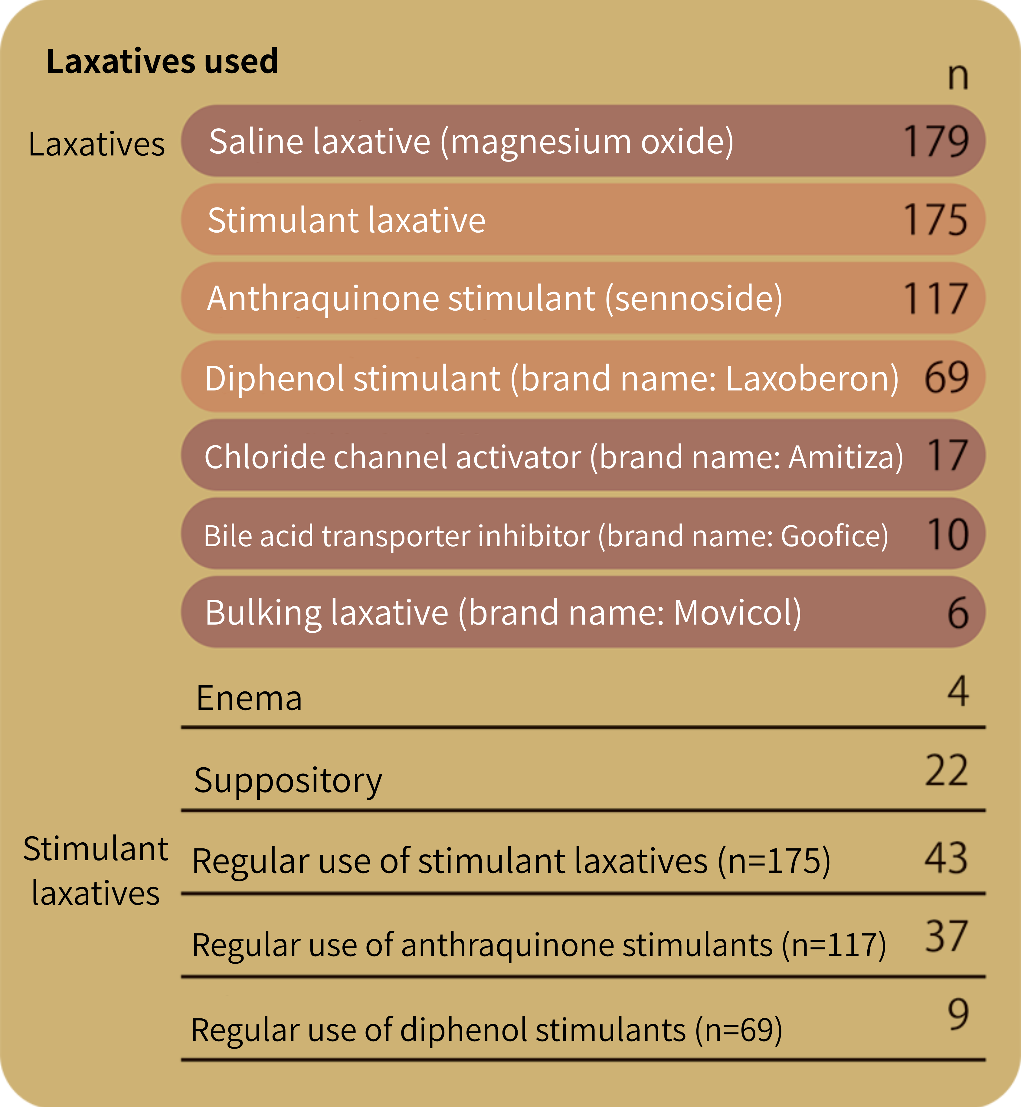 Project Assistant Professor Takaoka analyzed data from 306 residents of special nursing homes for older adults, who were given laxatives to treat their chronic constipation. There are various types of laxatives available, such as saline and stimulant ones. The study found continuous use of the same medication, even when the bowel movement-related problem did not improve. (“n” denotes sample size.)