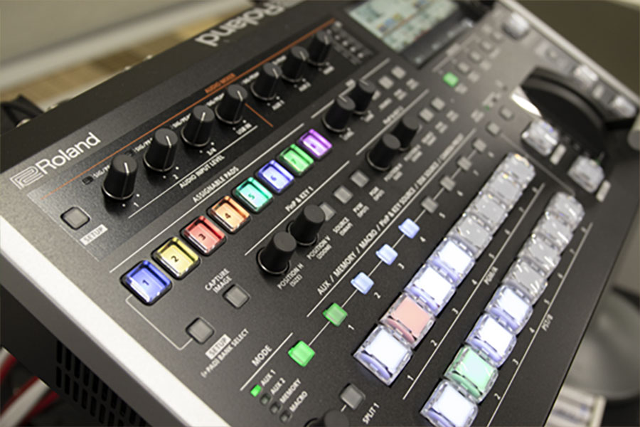 Roland V-80HD映像スイッチャーを常設。専用のルーターを介した高速回線で、SRTプロトコルでの1080p映像の相互送受信と記録が実行できます。