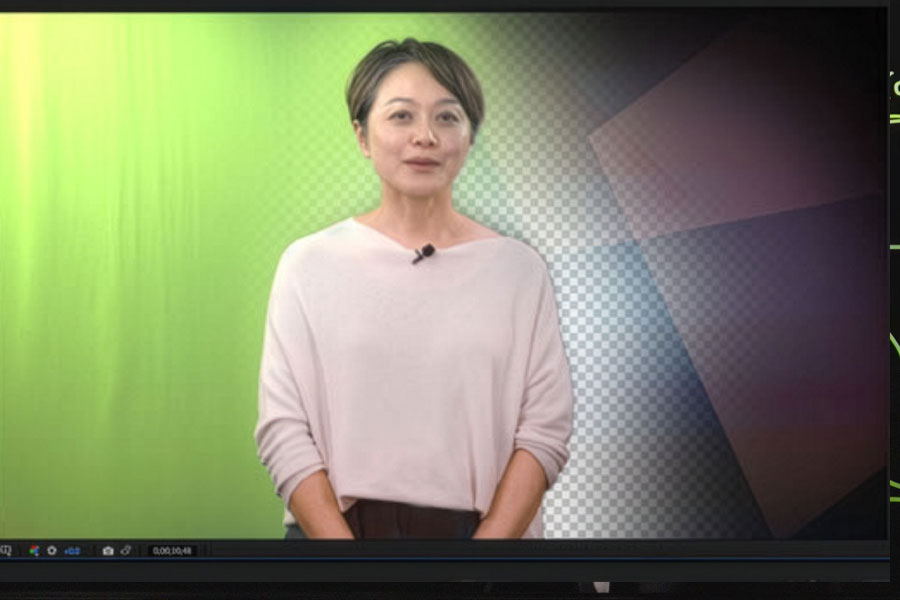 グリーンバック背景で資料や映像を合成することもリアルタイムで実現します。TVスタジオレベルの照明を使い、講師をくっきりと抽出できます。