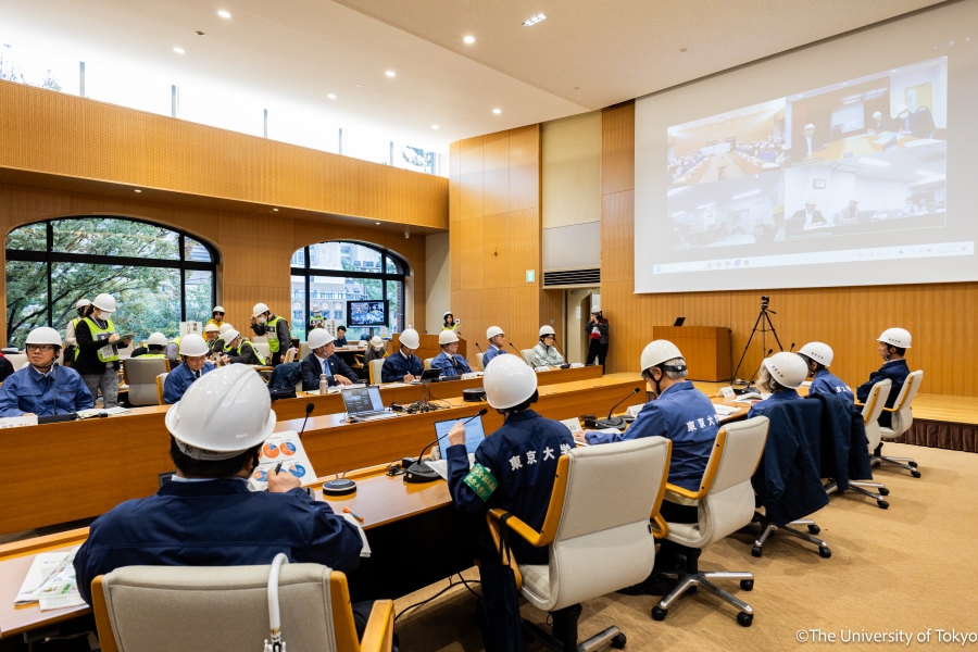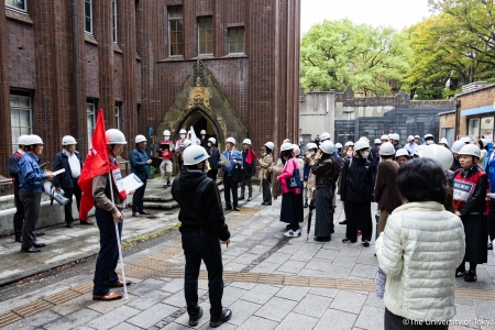 今年度は、平日の日中に東京都と千葉県において震度6弱の揺れを伴う地震が発生したという想定のもと、藤井総長をはじめとする役員、本部教職員が一斉避難し、点呼確認や安否確認訓練を行いました。