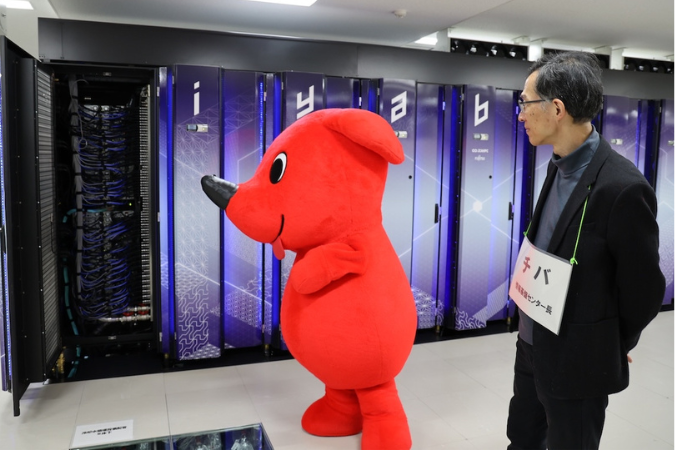 スパコンツアーに参加する千葉県のマスコットキャラクター・チーバくんと情報基盤センターの千葉センター長(情報基盤センター)。