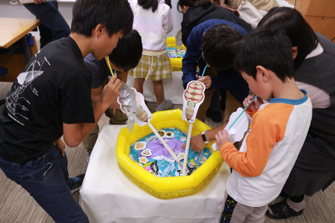 伸縮自在な触腕(しょくわん)の動きを再現できるアオリイカを作って魚を捕まえる来場者のみなさん(大気海洋研究所)。