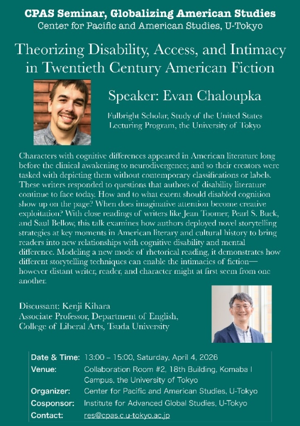 アメリカ太平洋地域研究センター(CPAS)では、4月4日に講演者としてEvan Chaloupka氏をお招きし、CPASセミナー「Theorizing Disability, Access, and Intimacy in Twentieth Century American Fiction」を開催いたします。