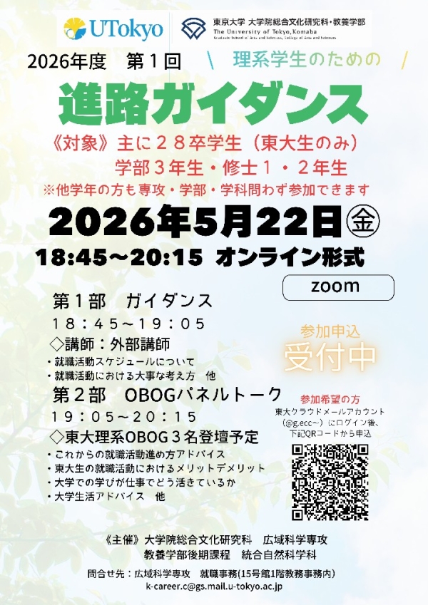 | お問い合わせ先 | 東京大学大学院総合文化研究科 広域科学専攻 就職事務(担当:星) Email:k-career.c(at)gs.mail.u-tokyo.ac.jp メール送信の際は(at)を@に変更してください。 |