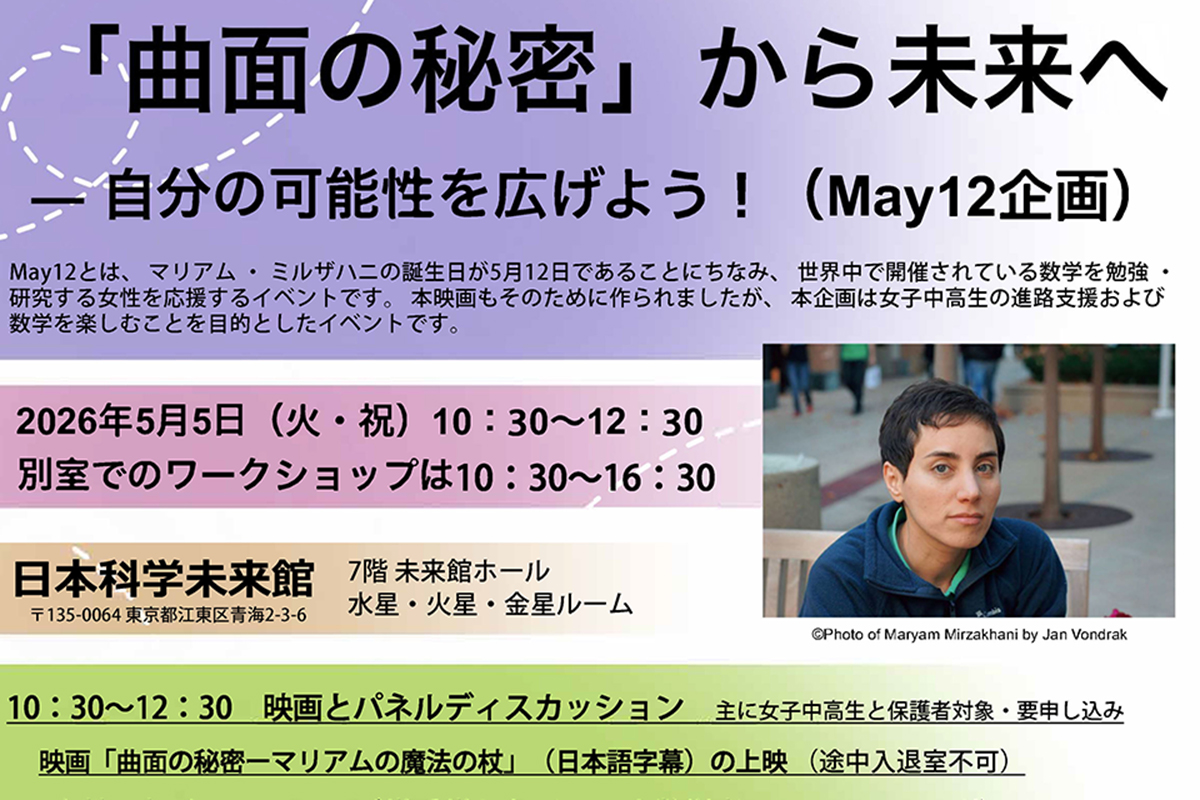 2026年5月5日(火・祝)、東京大学国際高等研究所カブリ数物連携宇宙研究機構(Kavli IPMU)は、(株)steAm、一般社団法人Girls Unlimited Programとの共催で、女子中高生の進路選択支援および数学を楽しむことを目的としたイベント「「曲面の秘密」から未来へ ― 自分の可能性を広げよう!(May12企画)」を日本科学未来館にて開催いたします。