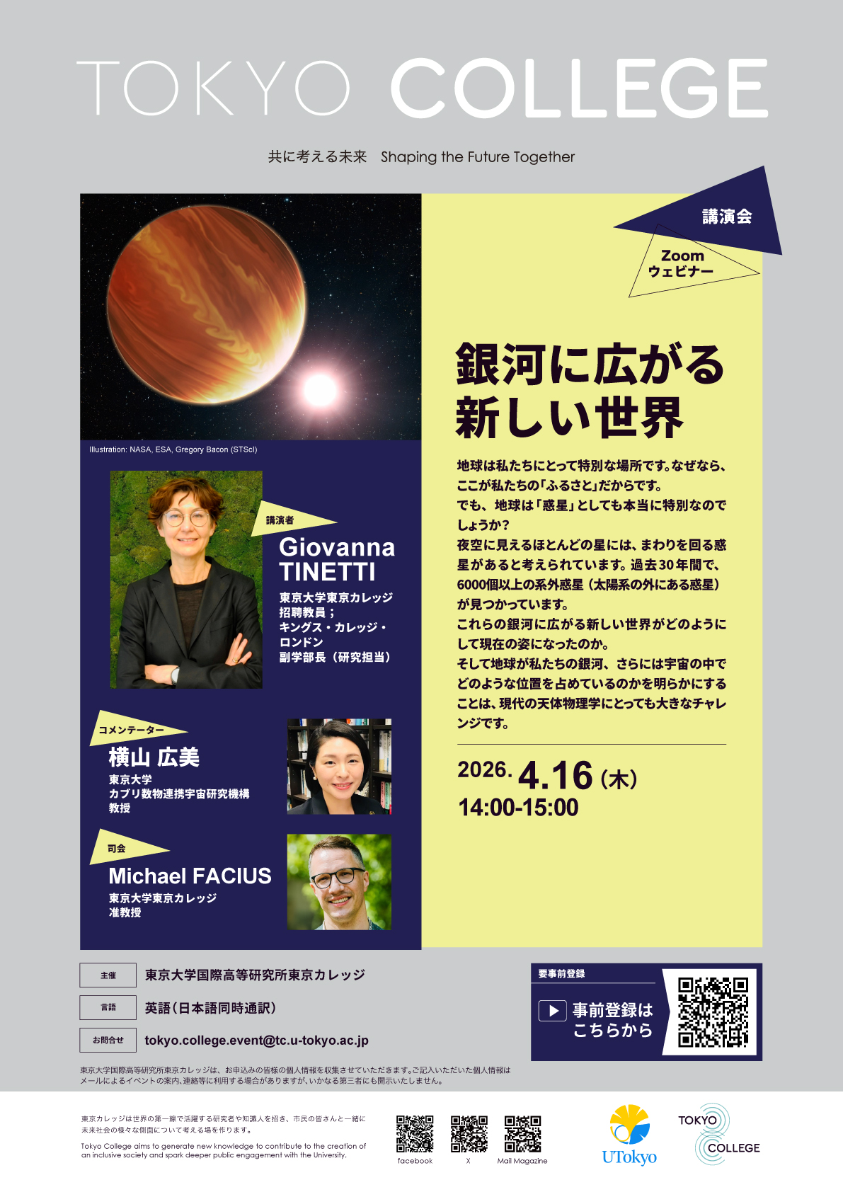 | お問い合わせ先 | tokyo.college.event@tc.u-tokyo.ac.jp 東京大学国際高等研究所東京カレッジは、お申込みの皆様の個人情報を収集させていただきます。ご記入いただいた個人情報はメールによるイベントの案内、連絡等に利用する場合がありますが、いかなる第三者にも開示いたしません。 |