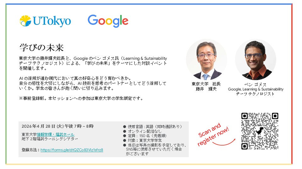 東京大学の藤井輝夫総長と、Google のベン ゴメス氏(Learning & Sutainability チーフ テクノロジスト)による、「学びの未来」をテーマにした対談イベントを開催します。