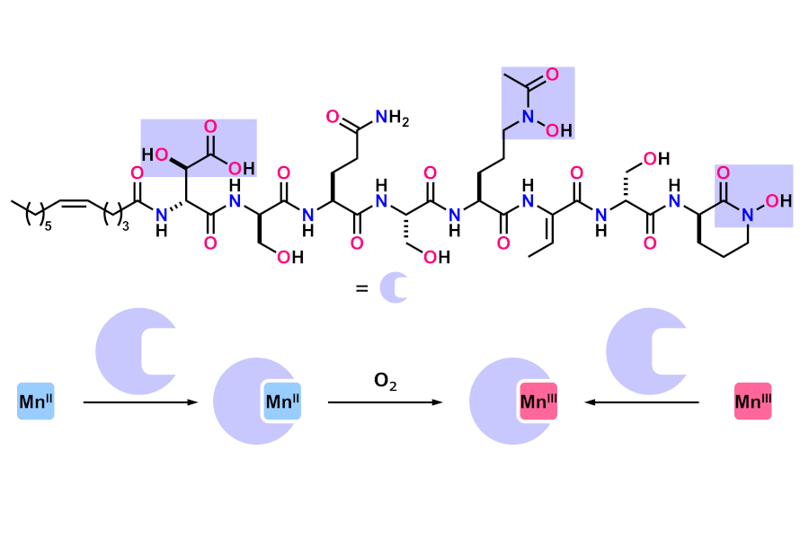 本研究チームは、まず固相合成法により天然物ロイヒケリンCを効率的に作り上げる方法を初めて確立しました。さらに、ロイヒケリンCの構造を部分的に改変した人工類縁体の合成とこれらを使った解析によって、天然物ロイヒケリンCがFe(III)に対して強く結合できる上、自然界ではほとんど進行しないMn(II)をMn(III)へと酸化する過程を促進するとともに、非常に不安定なMn(III)を安定化できることを見出しました。これは、深海など極限環境に生息する微生物がどのように金属と関わるかをより深く理解する上で重要な成果です。また、全合成を利用した分子編集が天然物のもつ未知の役割を明らかにするために有効であることを実証しました。