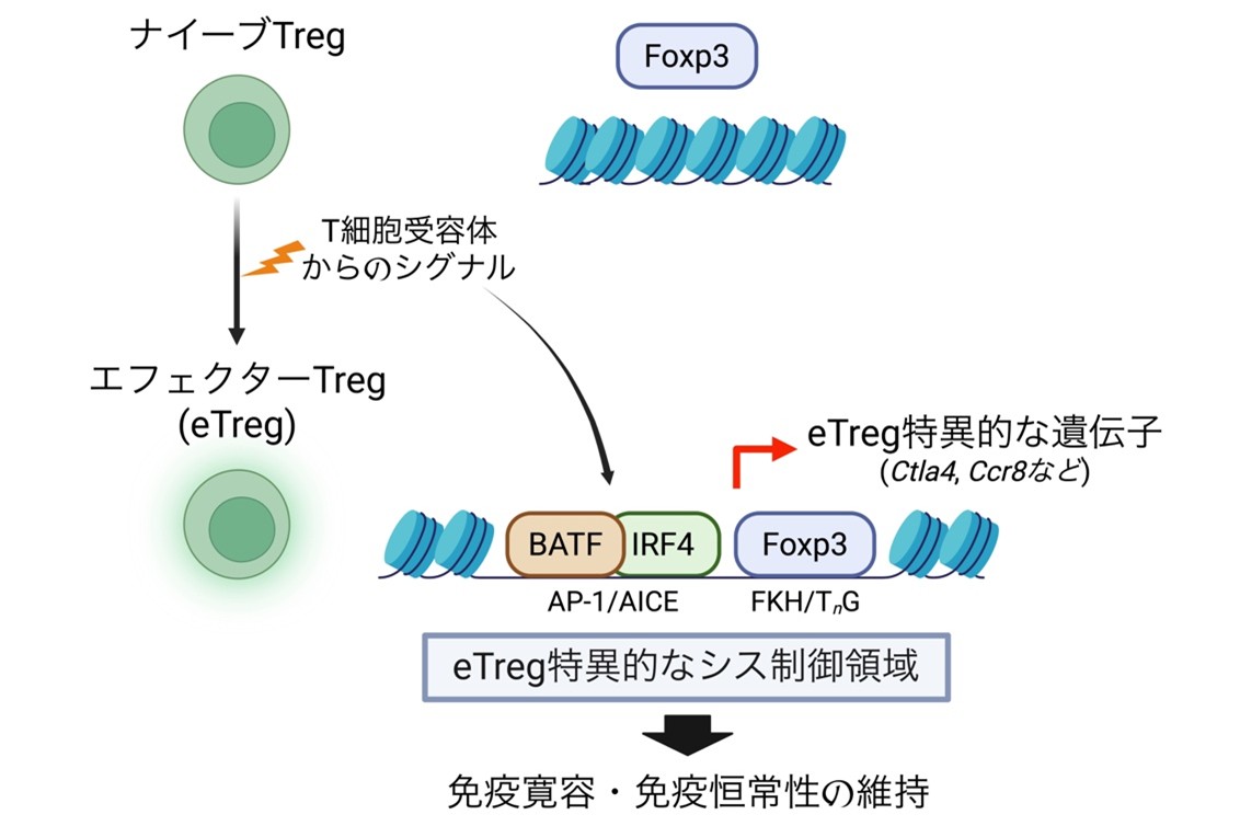 東京大学大学院薬学系研究科の村上龍一 助教、堀昌平 教授らの研究チームは、免疫応答を抑制する制御性T細胞(regulatory T cell:Treg)のマスター転写因子Foxp3が、転写因子BATFと協調することで、免疫抑制活性の高いエフェクターTreg(eTreg)を特徴づけるクロマチン構造と遺伝子発現プログラムを形成することを明らかにしました。