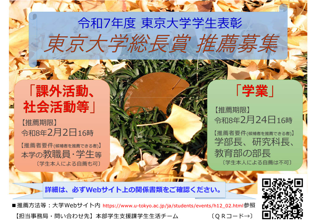 令和7年度学生表彰「東京大学総長賞」推薦募集について