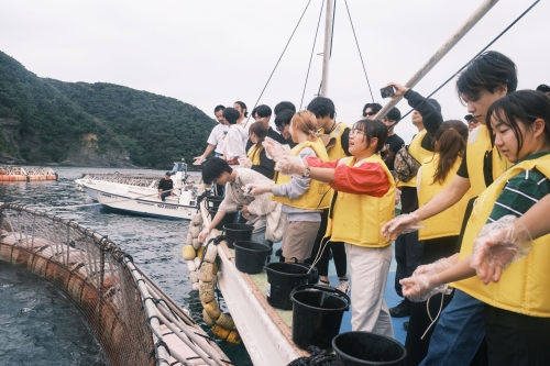 対馬には海洋プラスチックごみが大量に漂着しています。その課題と向き合い、世界最先端のサスティナブル・アイランドを目指す対馬の方々によるレクチャーと議論を実施しました。前田剛氏(対馬市未来環境部SDGs戦略課副参事兼係長)からは地域の方々や企業を巻き込んだ市の取り組みについて解説いただき、質疑応答も活発に行われました。漂着したプラスチックごみを見学し、さらに分別、再生するためのペレット加工施設を訪問することで、問題の深刻さを実感しました。 また対馬でも温暖化による海水温上昇や水質変化により、生態系に影響が出ていることも、漁業関係者からのレクチャーやボートでの見学を通じて実感しました。食害生物の繁殖により藻場の急滅し、漁業に影響が出ているなかで、食害生物を利用した料理や、養殖や観光等を資源として取り組む前向きな姿勢を学びました。