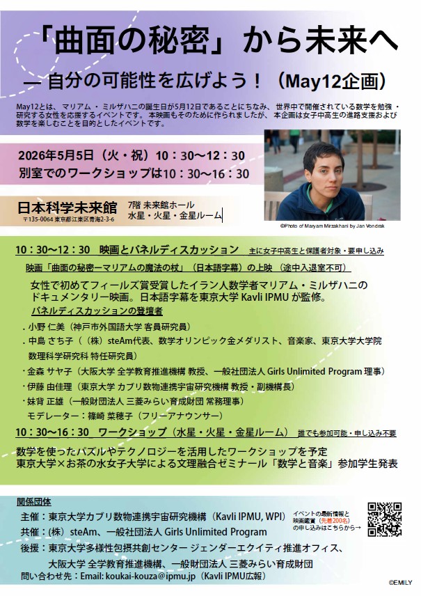 2026年5月5日(火・祝)、東京大学国際高等研究所カブリ数物連携宇宙研究機構(Kavli IPMU)は、(株)steAm、一般社団法人Girls Unlimited Programとの共催で、女子中高生の進路支援および数学を楽しむことを目的としたイベント「「曲面の秘密」から未来へ ― 自分の可能性を広げよう!(May12企画*1)」を日本科学未来館にて開催いたします。