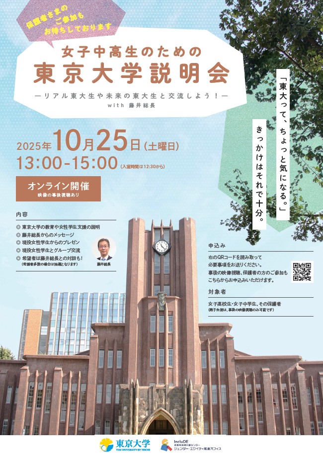 2025年10月25日、ジェンダー・エクイティ推進オフィス主催のイベント「女子高校生のための東京大学説明会-リアル東大生や未来の東大生と交流しよう!―with 藤井総長」が開催されました。