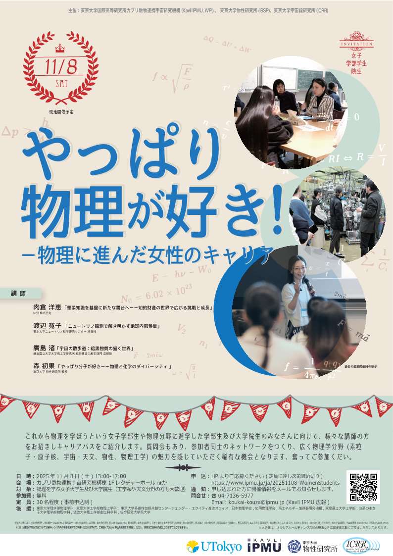 2025年11月8日(土)に東京大学カブリ数物連携宇宙研究機構(Kavli IPMU)、東京大学物性研究所、東京大学宇宙線研究所の主催による女子学部生・院生向けイベント「第10回 やっぱり物理が好き! ~物理に進んだ女性のキャリア~」が開催されることになりましたので、お知らせいたします。