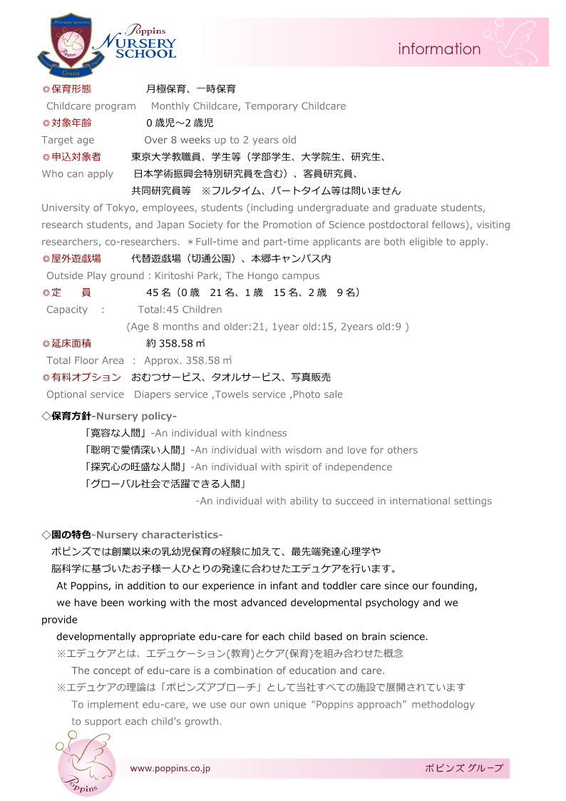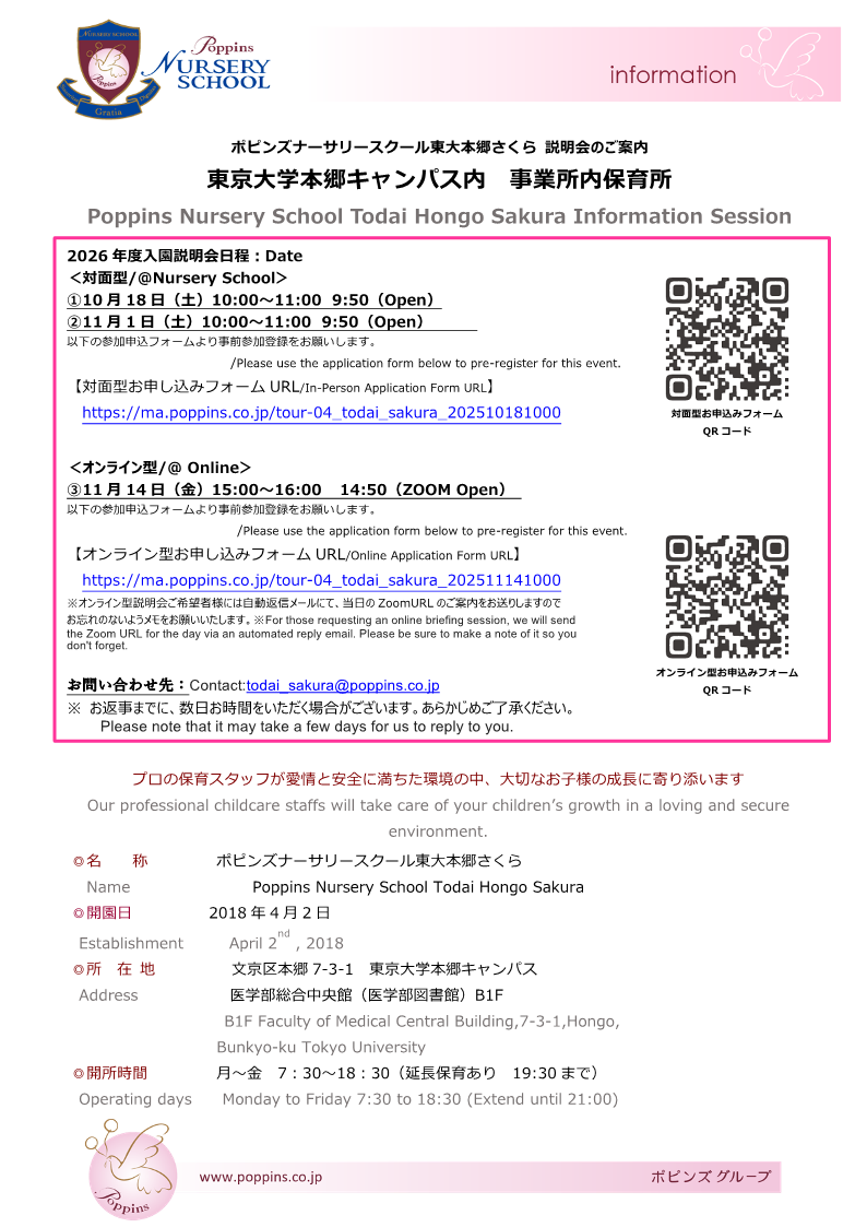 2026年度に「ポピンズナーサリースクール東大本郷さくら」への入園を希望される方を対象とした、説明会を、下記日程にて開催いたします。